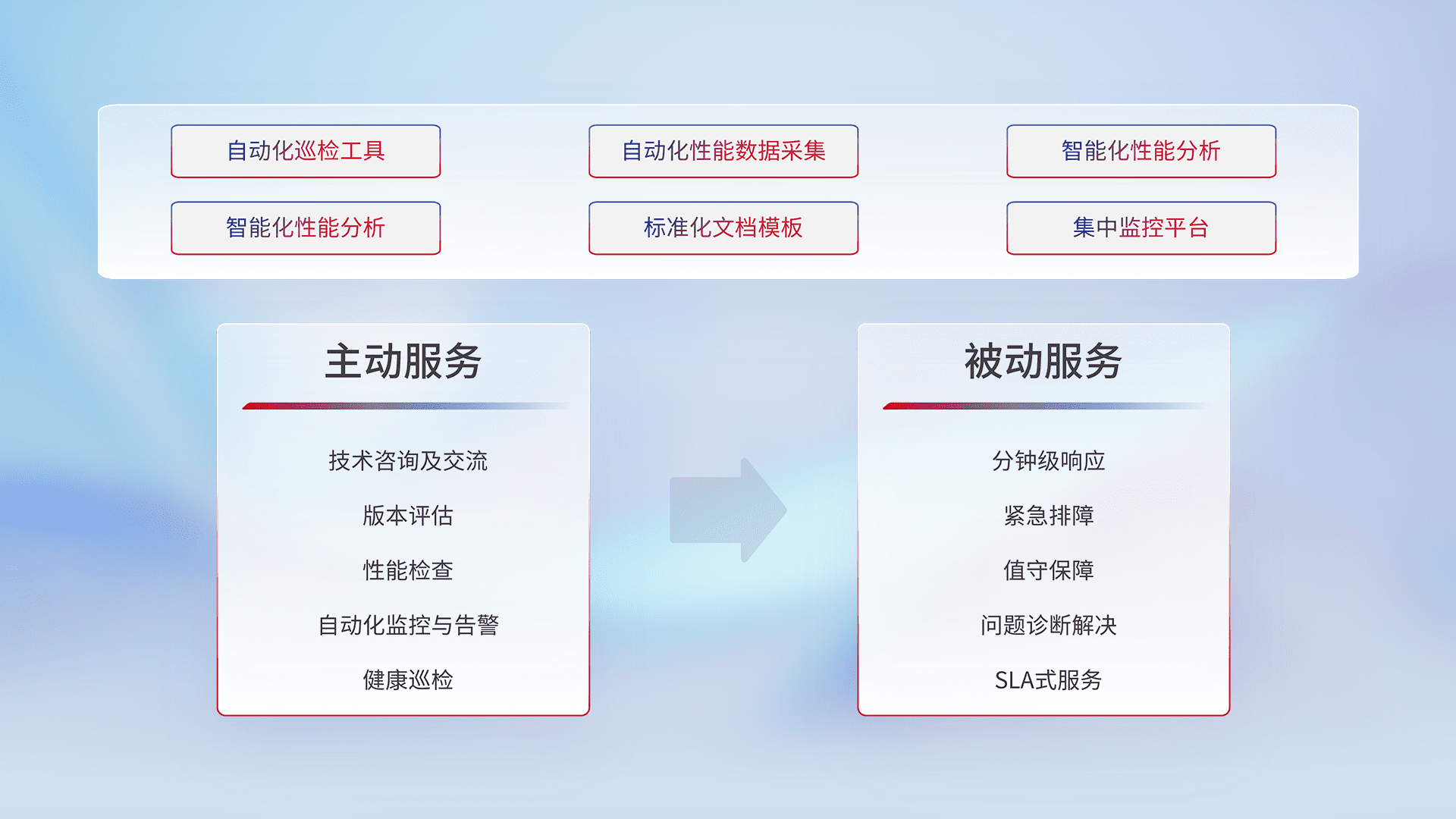 智能化工具和标准化文档,,,保障服务质量,,,提供主动服务(包含技术咨询、、、版本评估、、、、性能检查、、、、自动化监控与告警、、健康巡检)和被动服务包含(分钟级响应、、紧急排障、、值守保障、、、、问题诊断解决、、、、SLA服务)。。